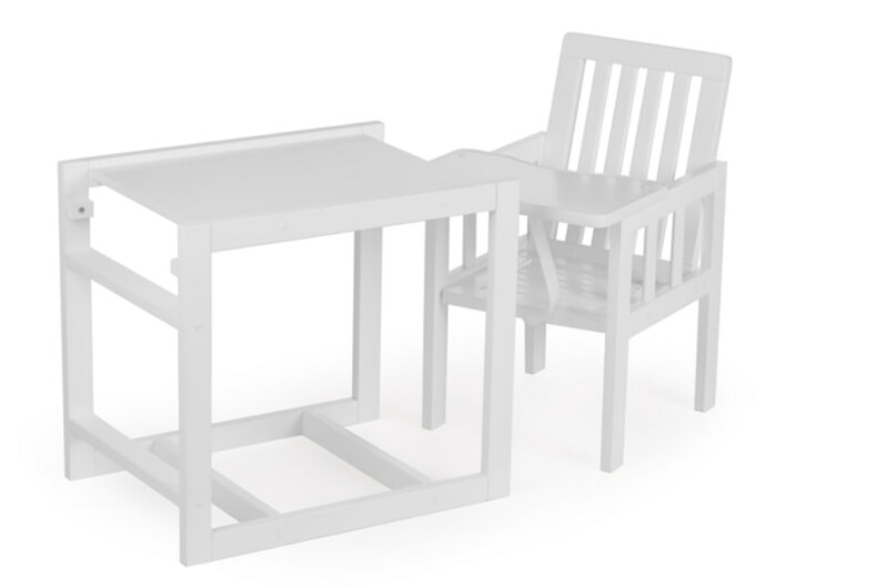 Згодом мультифункціональний стілець для годування трансформується у відокремлений стіл для ігор та стілець-крісло.