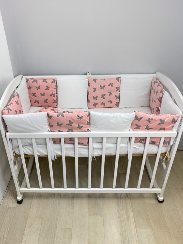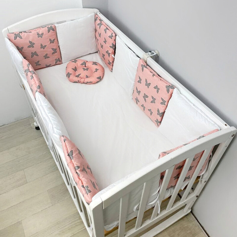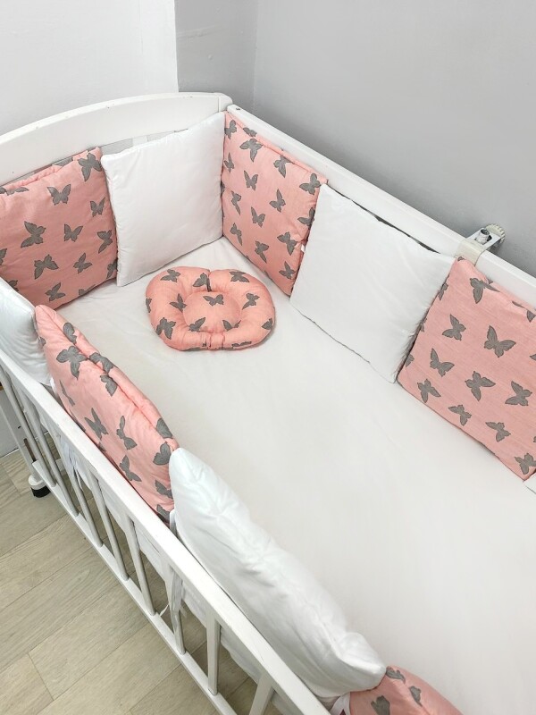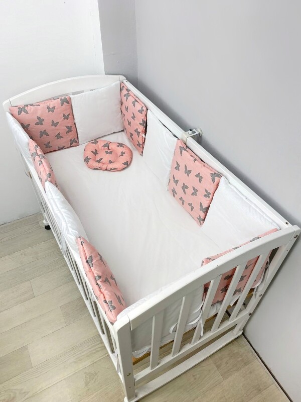 Захист у ліжечко - плоскі подушки на 4 боки + простирадло та подушка, Біло- персиковий з метеликами