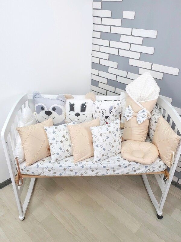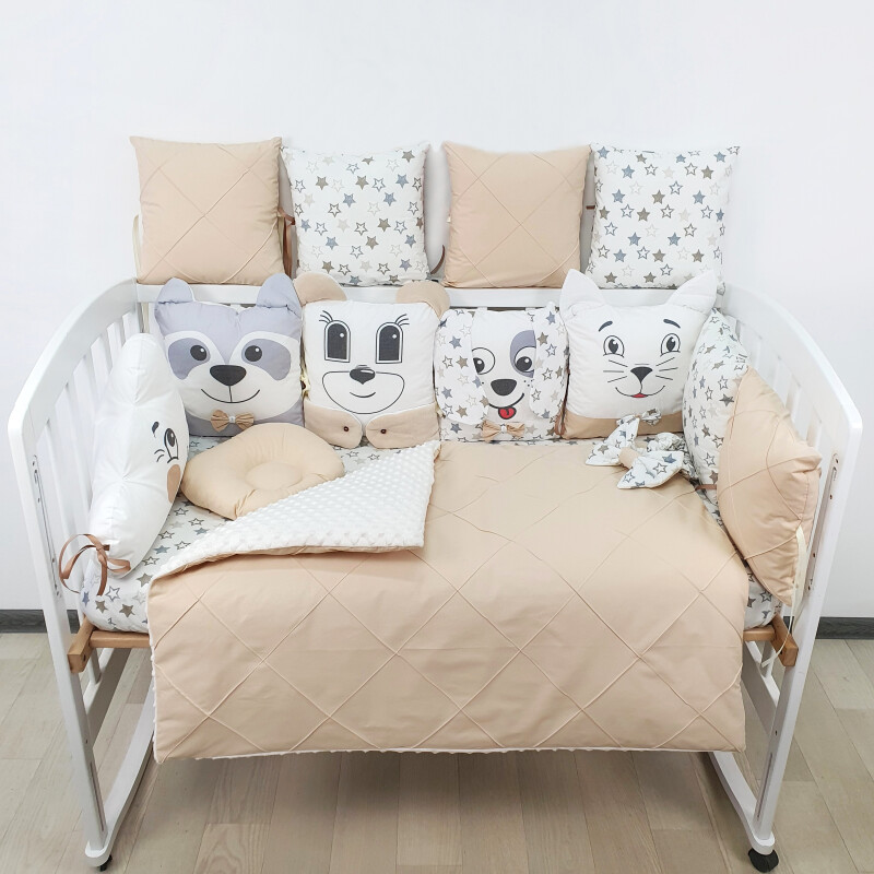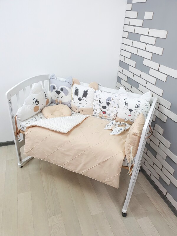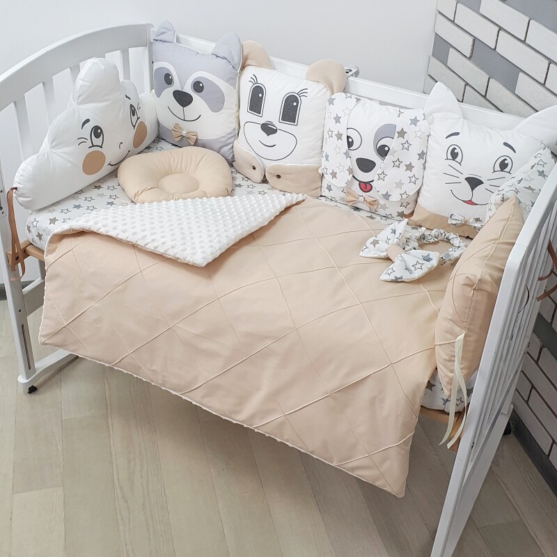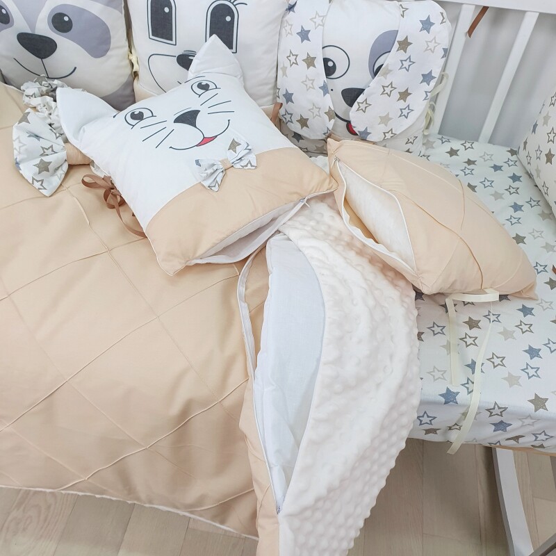 Характерною особливістю цього комплекту є присутність м'якої хмаринки з мордочкою або 2 подушок, які створюють затишну та безпечну атмосферу для вашого дитинства. Приємне доповнення - підковдра з плюшевим покриттям та біла бавовняна ковдра із силіконовим утеплювачем розміром 100*80 см, які гарантують тепло та комфорт.
