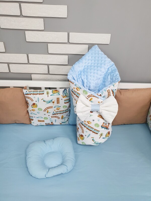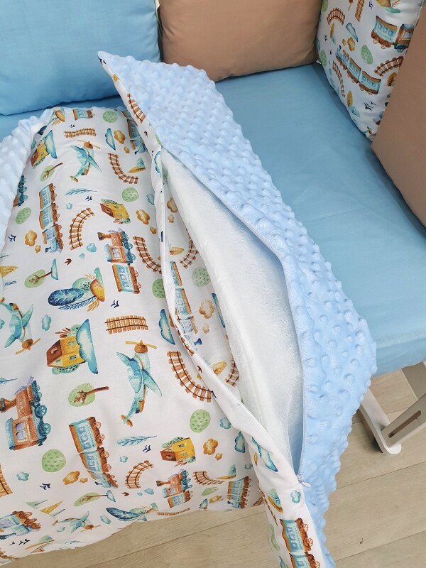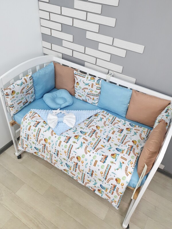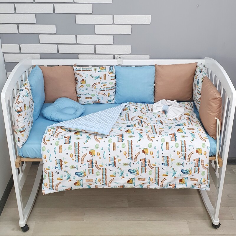 Комплект постільної білизни, в дитяче ліжечко. Блакитно-бежевий Потяги