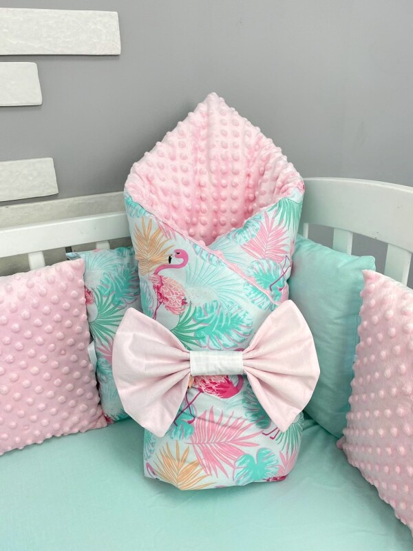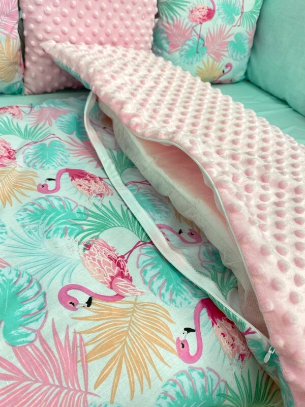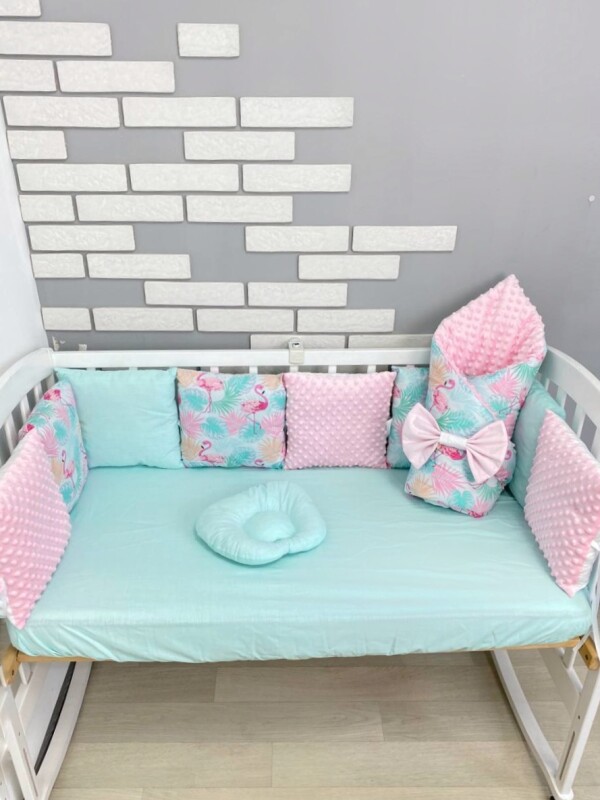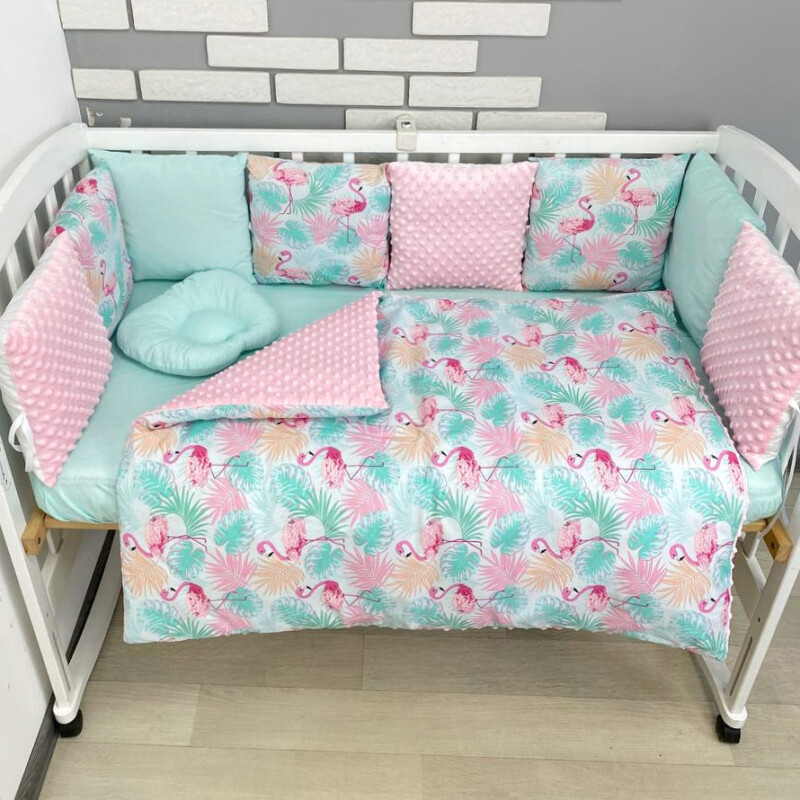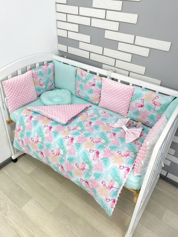 Juno, інтернет-магазин дитячих товарів\\Комплект постільної білизни, в дитяче ліжечко. Фламінго м'ятно-рожеві