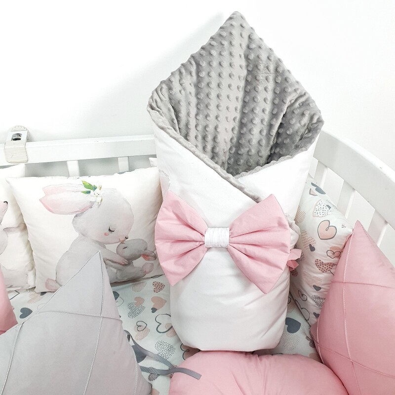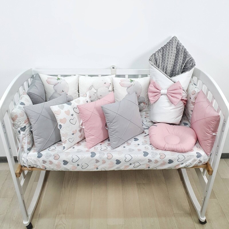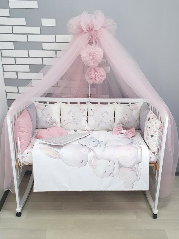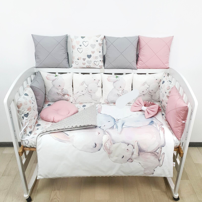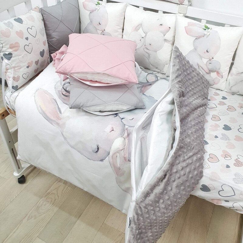 Juno, інтернет-магазин дитячих товарів\\Комплект постільної білизни, в дитяче ліжечко. Зайчики з мамою пудрово-сірі, з подушками