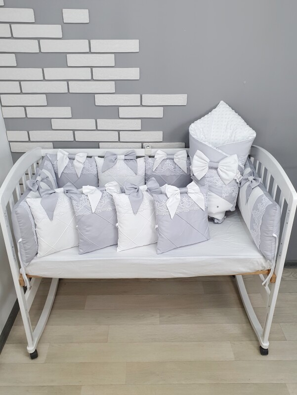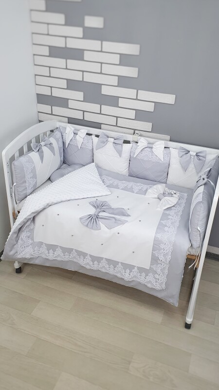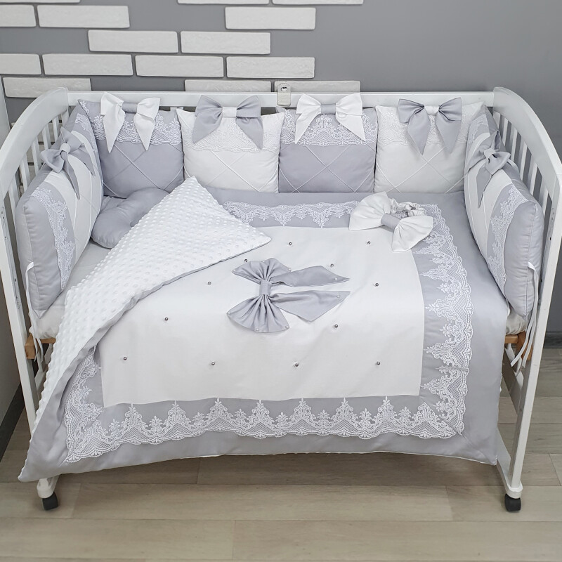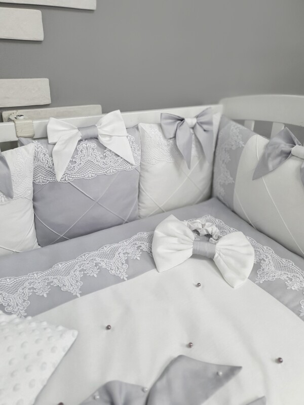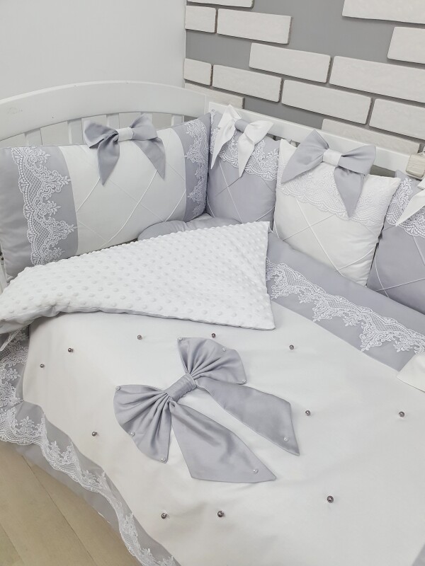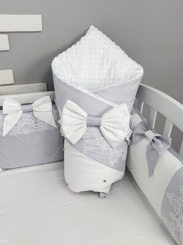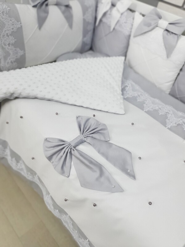Комплект Сіро-білий з бантами та мереживом, ковдра з нашитим великим бантом