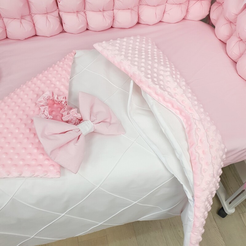 Ковдра з плюшем, обладнана силіконовим утеплювачем у чохлі, розміром 100*80 см, забезпечить м'якість і тепло в холодні дні. Бант на резинці надає ліжечку вишуканого вигляду, доповнюючи його стиль.