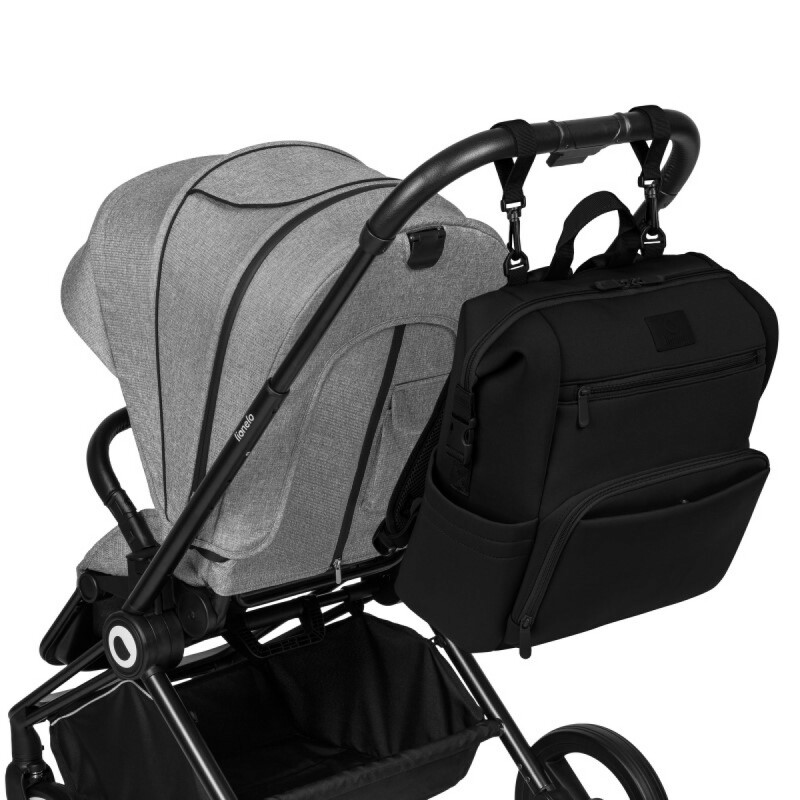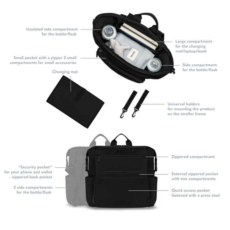 Ремені для підвішування до коляски дозволяють завжди тримати рюкзак під рукою. У комплект входить міні-пеленальний столик, що стане в нагоді для переодягання дитини будь-де. Рюкзак також ідеально підходить для мандрівників, оскільки його розміри відповідають нормам ручної поклажі в літаку. Завдяки пряжкам рюкзак можна регулювати за розміром, і він легко поміщається під сидінням. У спеціальній кишені для ноутбука зручно зберігати робоче обладнання.