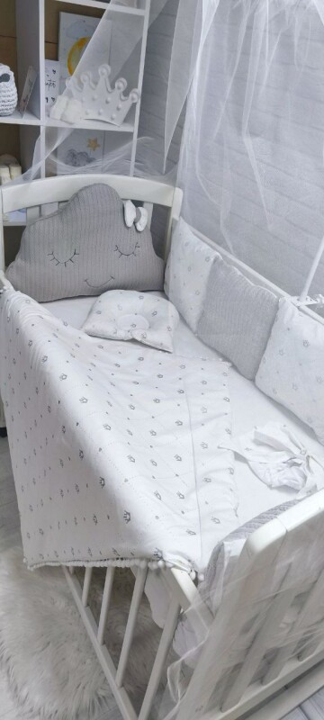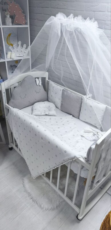 Набір постільний в дитяче ліжечко з захисними бортиками подушки, балдахін, кишеня Зірочки сірі