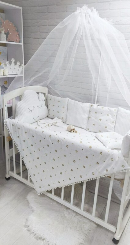 Набір постільний в дитяче ліжечко з захисними бортиками подушки, балдахін, кишеня Зірочки рожеві