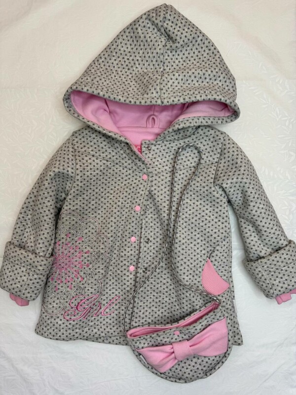 Стильна демісезонна кофта для дівчинки з капюшоном і милою сумочкою у комплекті. Виконана з м'якого трикотажного матеріалу, що забезпечує комфорт і тепло в прохолодну погоду.