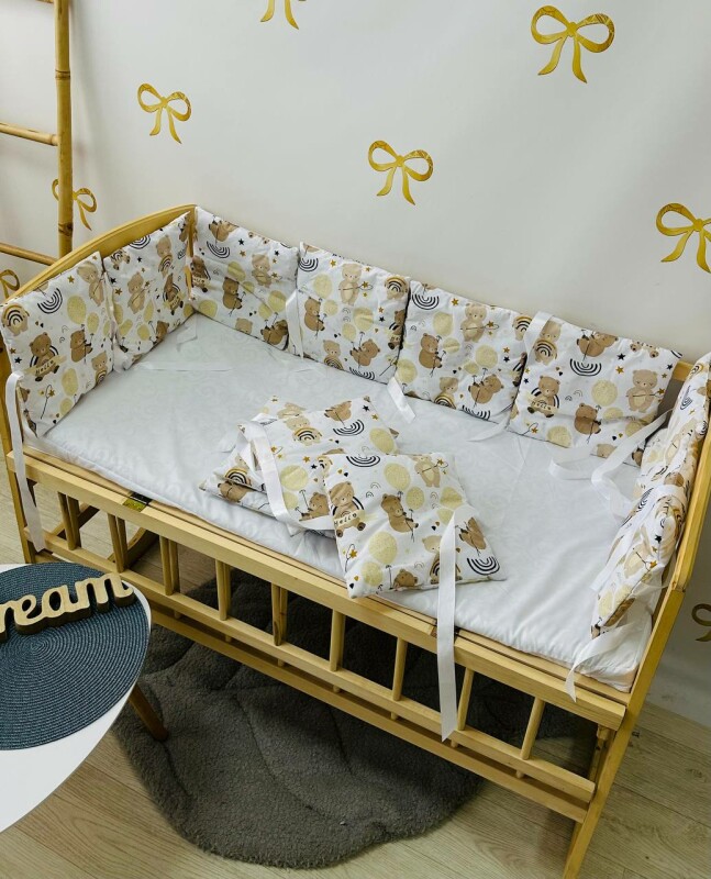 • захисний бампер убезпечить дитину від протягів і допоможе уникнути ударів, захистивши цим малюка від ударів об дерев'яні прути ліжечка;