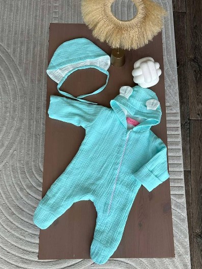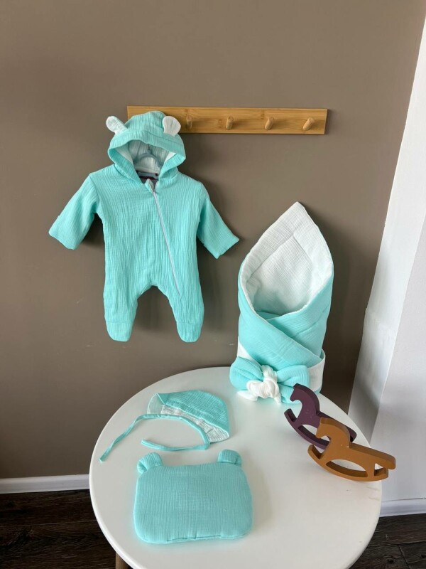 Juno, інтернет-магазин дитячих товарів\\Янголятко муслін набір универсальний комбінезон 0-3 місяці, конверт - плед, шапочка М'ята