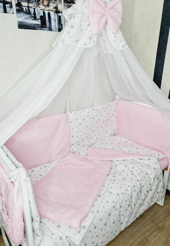 Набір постільний в дитяче ліжечко з захисними бортиками подушки, балдахін, кишеня Зірочки рожеві