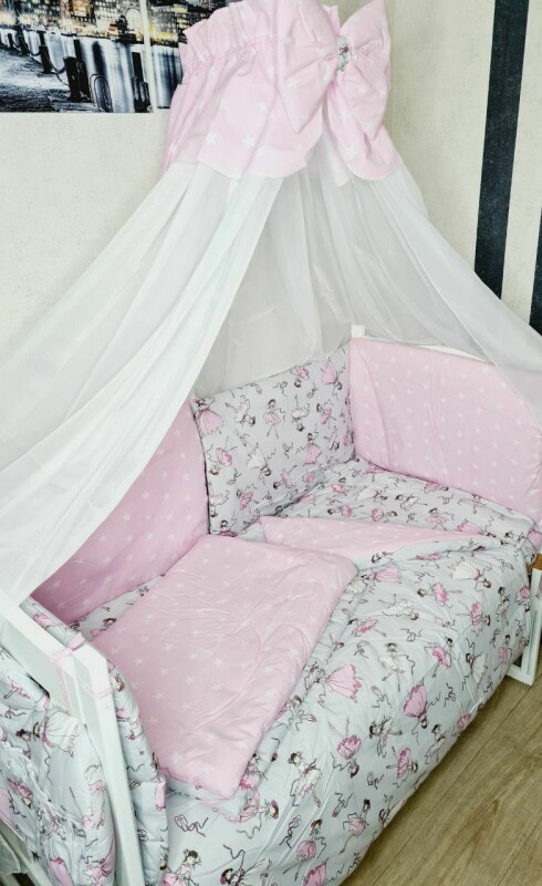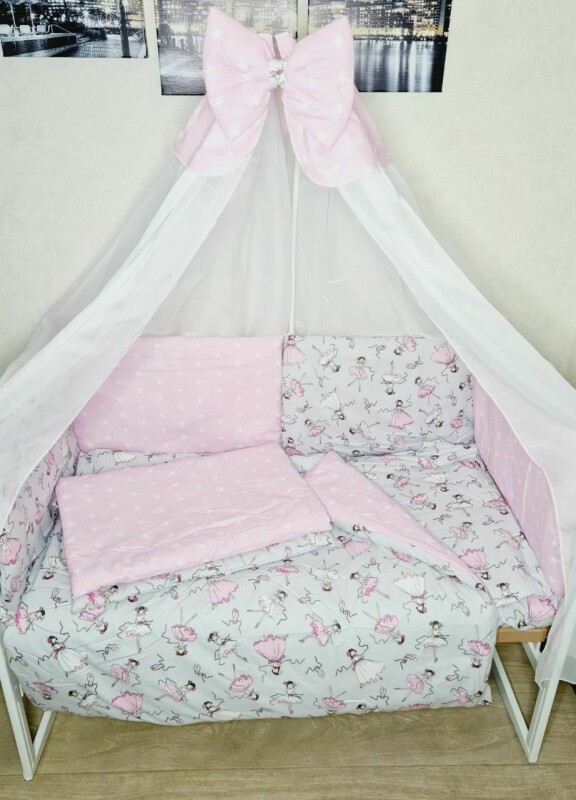 Набір постільний в дитяче ліжечко з захисними бортиками подушки, балдахін, кишеня Балерина рожева