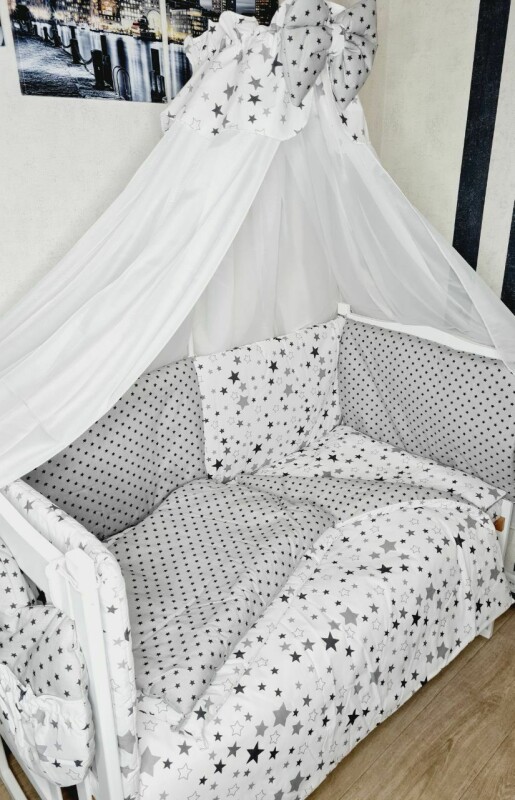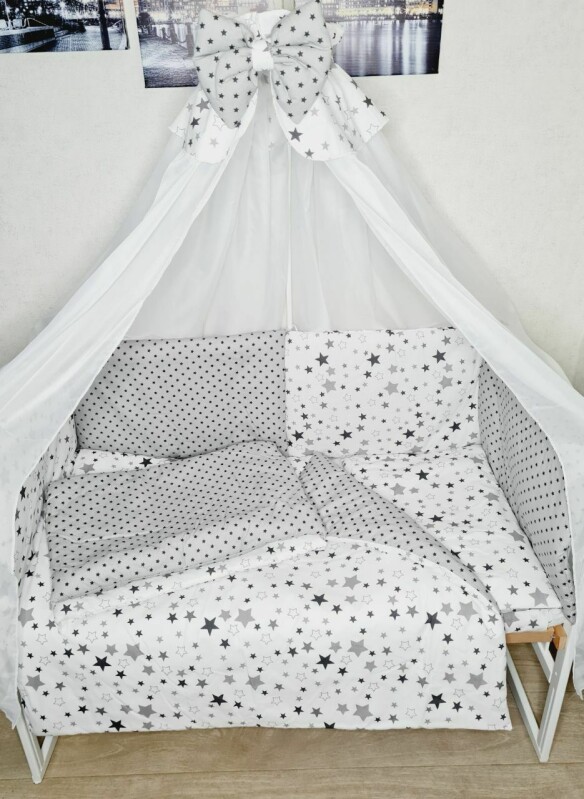 Набір постільний в дитяче ліжечко з захисними бортиками подушки, балдахін, кишеня Зірочки сірі