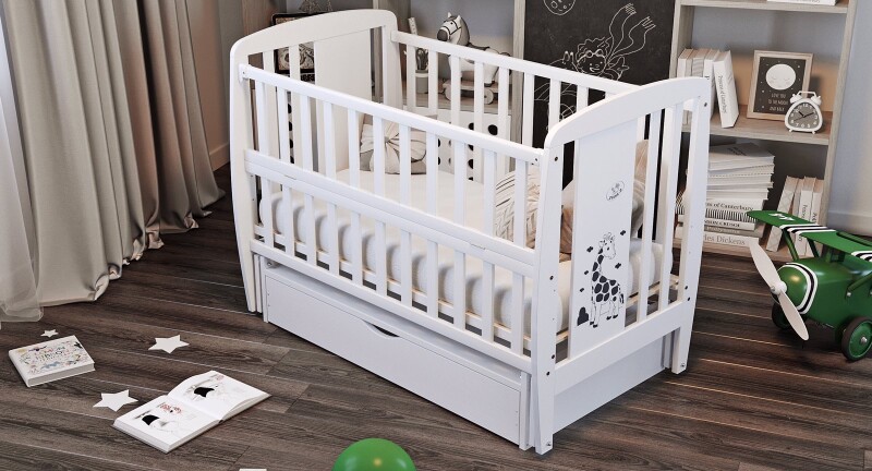 Дитяче ліжечко для новонароджених ДУБОК "Жираф" з шухлядою та поперечним маятником в білому кольорі