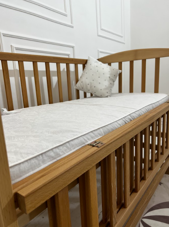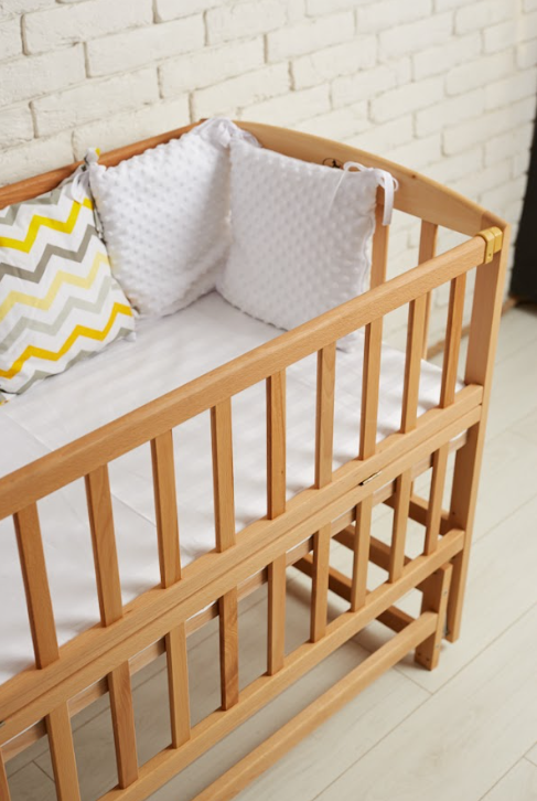 Велика увага приділена безпеці: планки розташовані на такій відстані одна від одної, щоб ручка або ніжка малюка не могли застрягти між ними. Боковина ліжка відкидна і фіксується міцними пластмасовими фіксаторами, забезпечуючи зручний доступ до дитини і одночасно гарантуючи її безпеку.