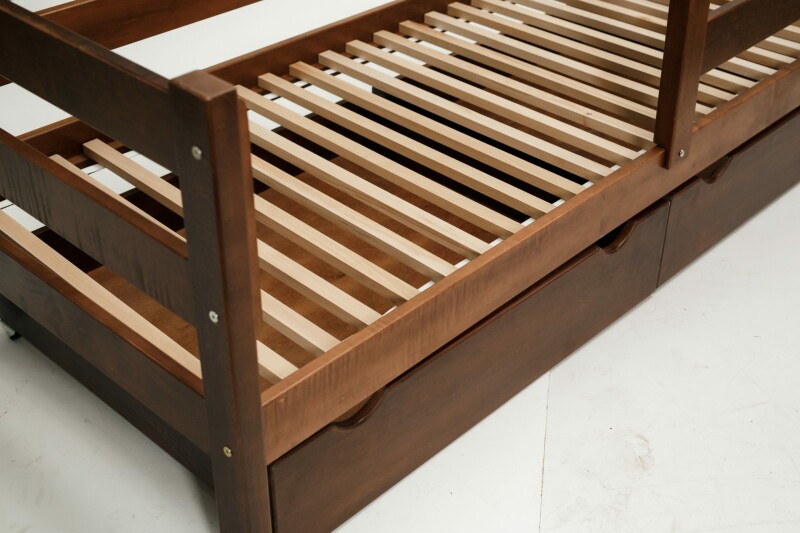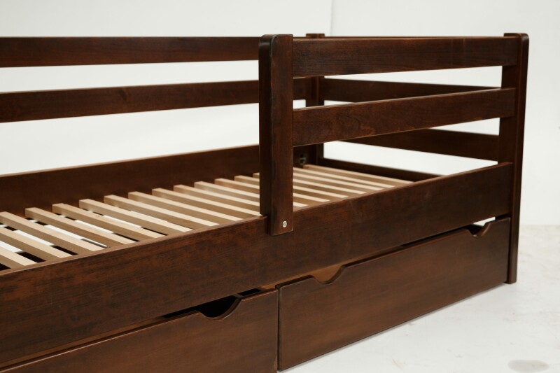 Модель має захисний борт для безпеки дитини, який за бажанням згодом не можна не прикріплювати. Під ліжком передбачено дві великі ящики на колесах для зберігання різних речей, які також виготовлені з дерева бук.