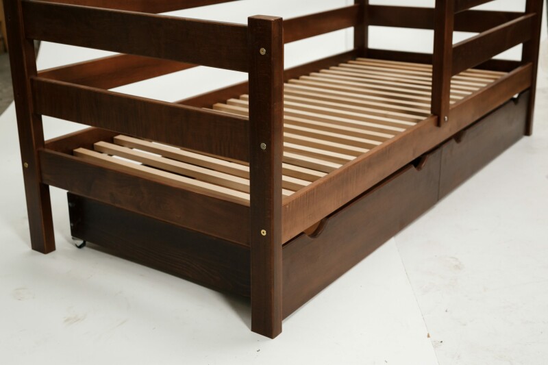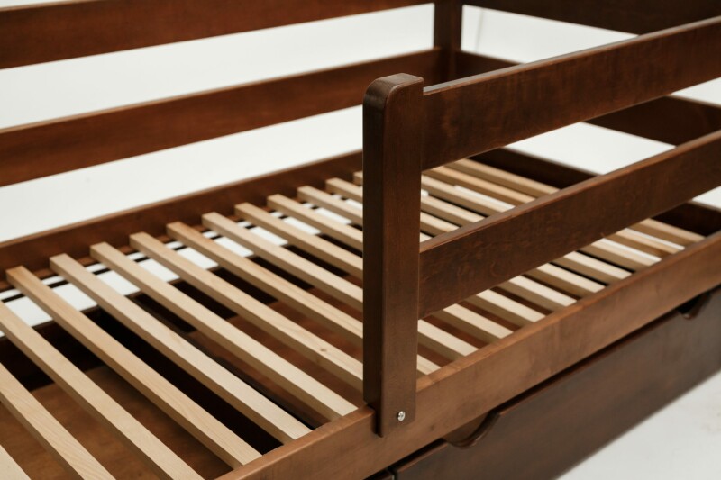 Модель має захисний борт для безпеки дитини, який за бажанням згодом не можна не прикріплювати. Під ліжком передбачено дві великі ящики на колесах для зберігання різних речей, які також виготовлені з дерева бук.