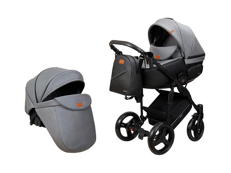 Нова колекція виконана в стильній високоякісній екошкірі, комплектується оригінальною рамою та модною сучасною пластиковою корзиною з елегантним аксесуаром – гаманцем для мами. Завдяки завуженій колісній базі візок легко проходить в ліфт.