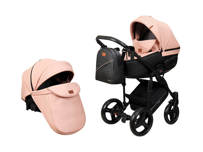 Нова колекція виконана в стильній високоякісній екошкірі, комплектується оригінальною рамою та модною сучасною пластиковою корзиною з елегантним аксесуаром – гаманцем для мами. Завдяки завуженій колісній базі візок легко проходить в ліфт.