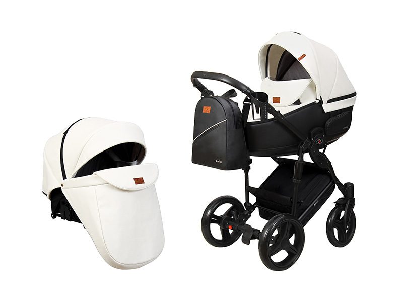 Нова колекція виконана в стильній високоякісній екошкірі, комплектується оригінальною рамою та модною сучасною пластиковою корзиною з елегантним аксесуаром – гаманцем для мами. Завдяки завуженій колісній базі візок легко проходить в ліфт.