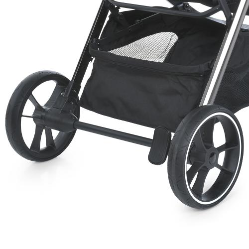 Стильний прогулянковий візок, який можна використовувати цілий рік. Великі PU (гумові) колеса діаметром 22,5 см пройдуть по будь-якому бездоріжжю. Зручний чохол на ніжки із застібкою-блискавкою посередині дозволить з легкістю посадити малюка, не знімаючи його з коляски. Ремінь-захист від сповзання додатково захистить дитину під час прогулянки.