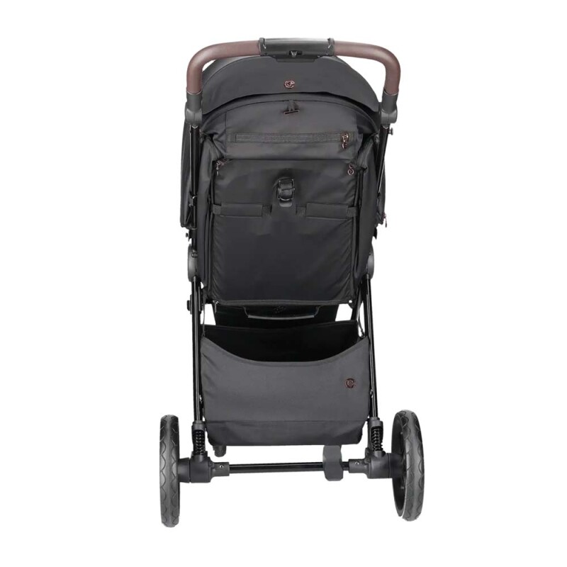 • Коляска представлена у чотирьох стильних кольорах, на глянсовій чорній рамі з легким блиском і витонченими мідними акцентами.