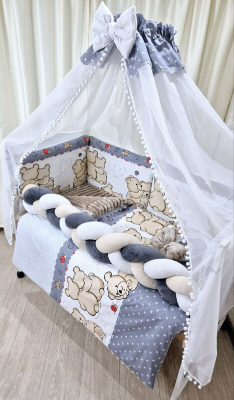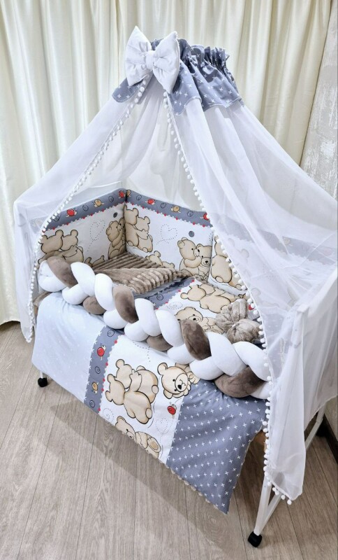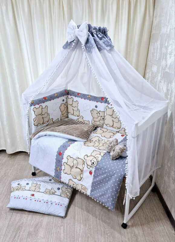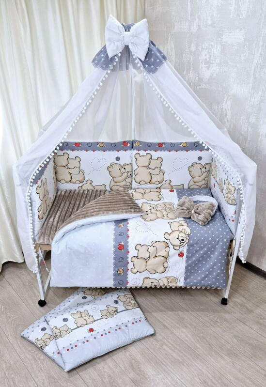 Підковдра: 90х110 см( на блискавці) Наволочка: 40х60 см (на блискавці) Простирадло на гумці 60х120  Захист -  борт,  6 шт подушок (двосторонні 60×40  на синтипоні ) Ковдра 90х110 см (на синтипоні) Подушка 40х60 см (на синтипоні) Балдахін (3.1м×1.5 м): З бубонами + бантик  Бант-гумка (робити конверт)