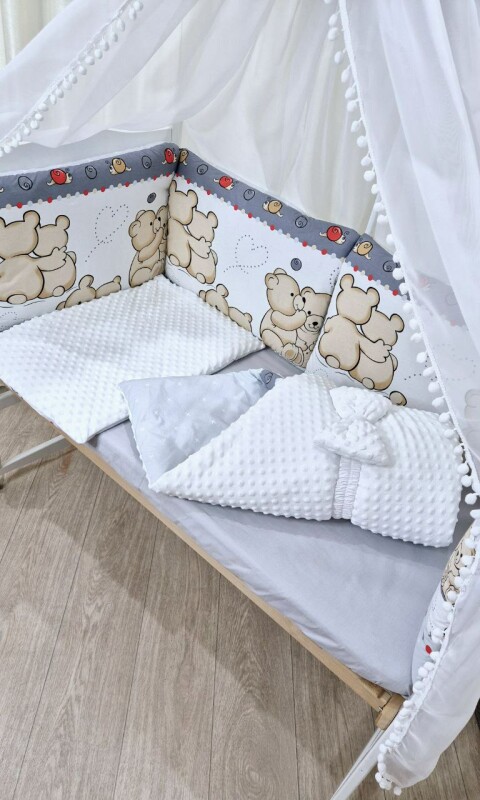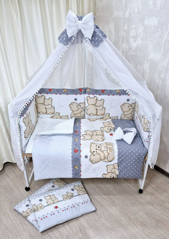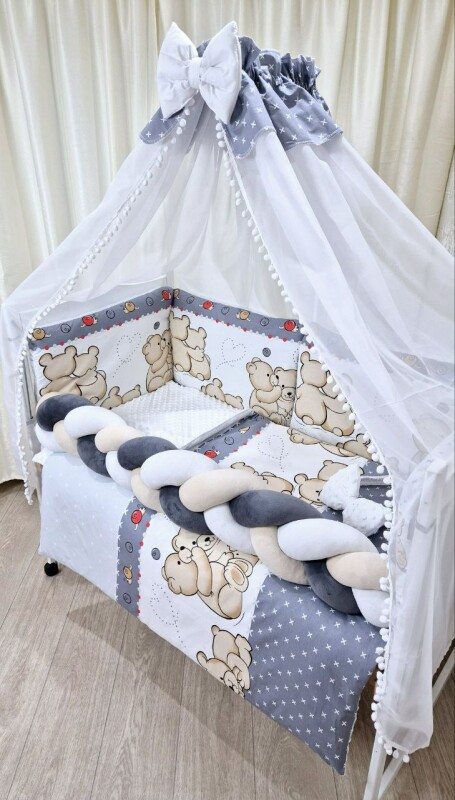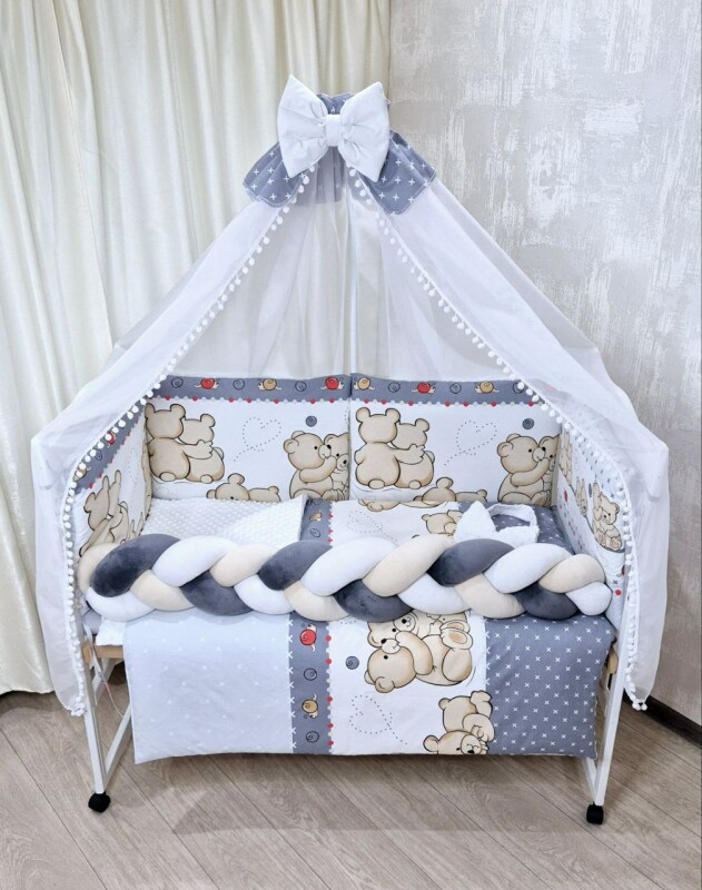 Підковдра: 90х110 см( на блискавці) Наволочка: 40х60 см (на блискавці) Простирадло на гумці 60х120 Захист - борт, 6 шт подушок (двосторонні 60×40 на синтипоні ) Ковдра 90х110 см (на синтипоні) Подушка 40х60 см (на синтипоні) Балдахін (3.1м×1.5 м): З бубонами + бантик Бант-гумка (робити конверт)