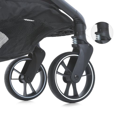 PU-колеса на підшипниках: передні – 17,5 см, задні – 22,5 см. Передні колеса з фіксатором, амортизатори на всіх колесах, знімні передні та задні колеса. Поліуретанові колеса з протектором забезпечують відмінне зчеплення з поверхнею.