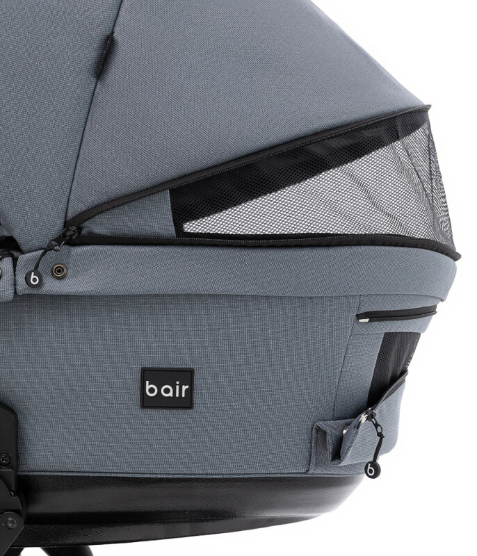 Люльку Bair Kiwi доповнює накидка з блискавками у верхній частині, що суттєво полегшує доступ до дитини за лічені секунди. А відворот із оглядовим віконцем дозволить захистити малюка від опадів або вітру.