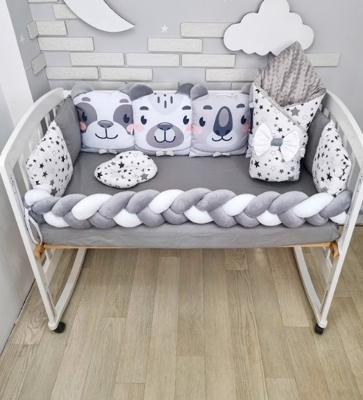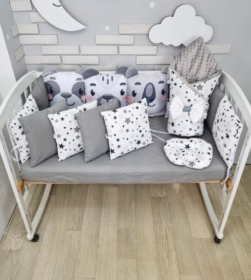 Комплект постільної білизни в дитяче ліжечко Сіро-білий в зірочку з 4 іграшками NEW