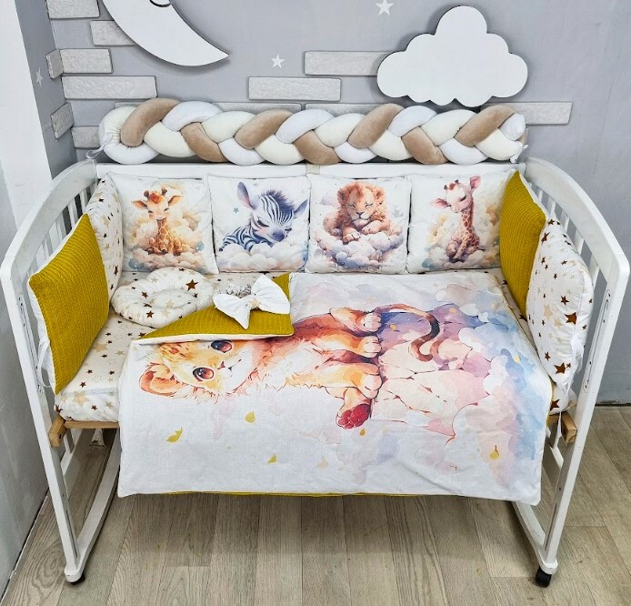 Juno, інтернет-магазин дитячих товарів / Товари / Комплект постільної білизни Принт Польська бязь Лев та звірята біло-гірчичні NEW