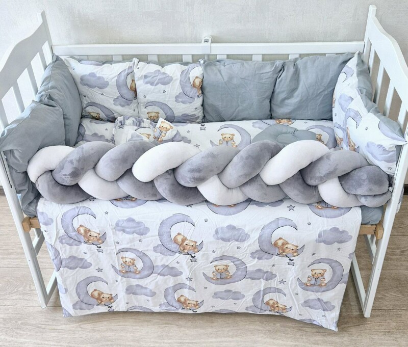 Juno, інтернет-магазин дитячих товарів / Товари / Комплект постільної білизни Bonna Elegance New в дитяче ліжечко Ведмедики на місяць сірий однотон