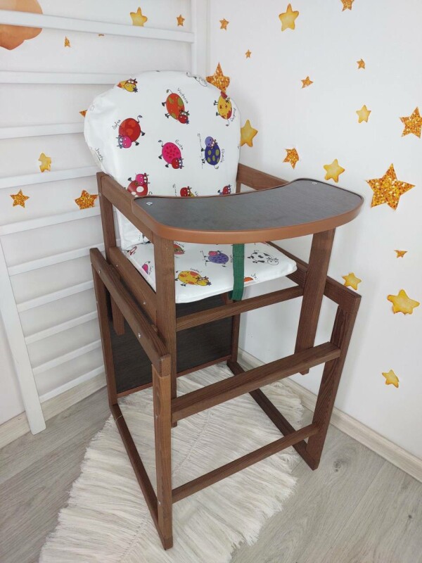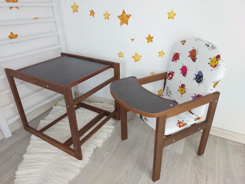Дерев'яний стільчик для годування може трансформуватися власне з високого стільця для годування з індивідуальною стільницею в стіл парту для годування, ігор та занять.