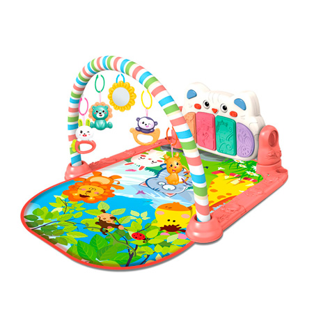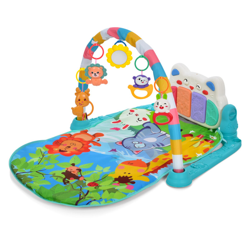 М’який килимок із яскравими малюнками забезпечує зручне місце для гри лежачи, а дуга з підвісними іграшками стимулює розвиток зору, уваги та дрібної моторики. Іграшки легко знімаються та можуть використовуватись окремо.