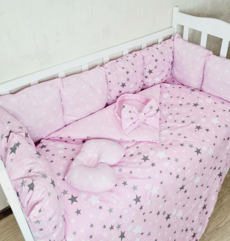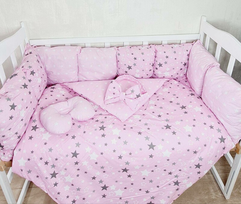 Juno, интернет-магазин детских товаров\\Комплект постільної білизни Bonna Eco в дитяче ліжечко Зірочки Рожеві-Сірі