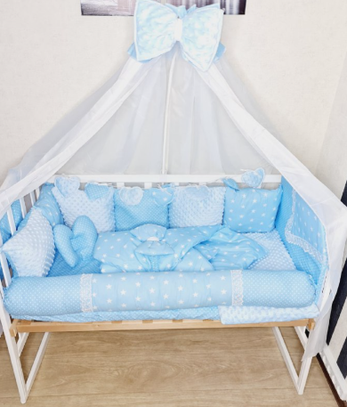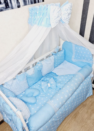 Захист у ліжечко - плоскі подушки на 4 боки + простирадло та подушка, Блакитно- білий в зірочку