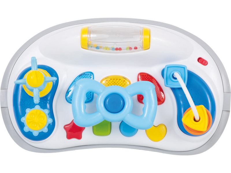 Ходунки з динамічною ігровою дошкою та навчальними іграшками, які імітують приладну дошку транспортного засобу, допомагають дитині вивчати форми, поверхні, кольори і звуки, а також додають рухомий ефект світлових відображень.