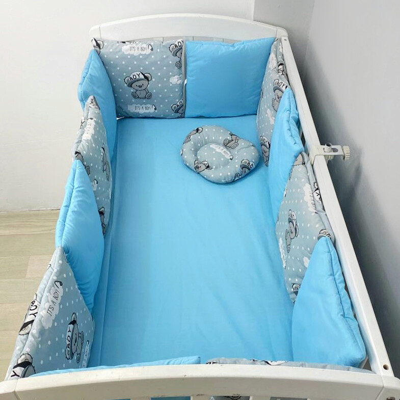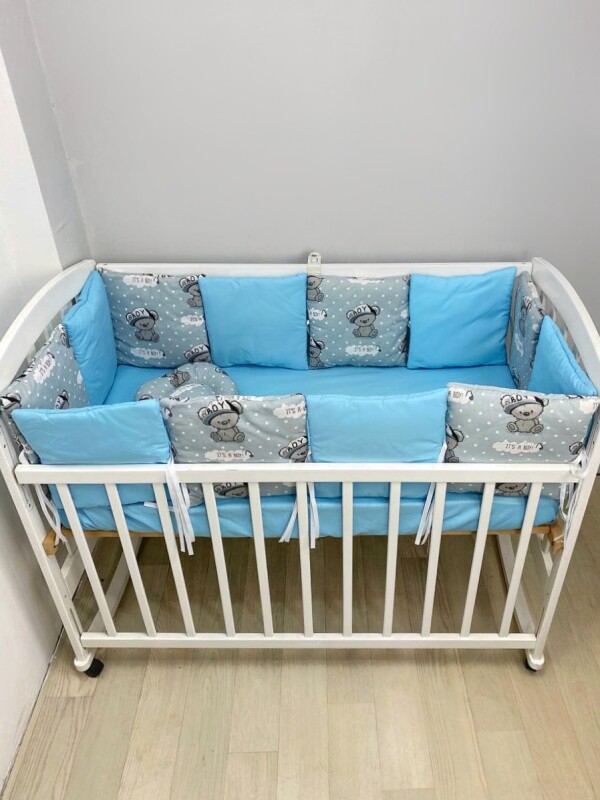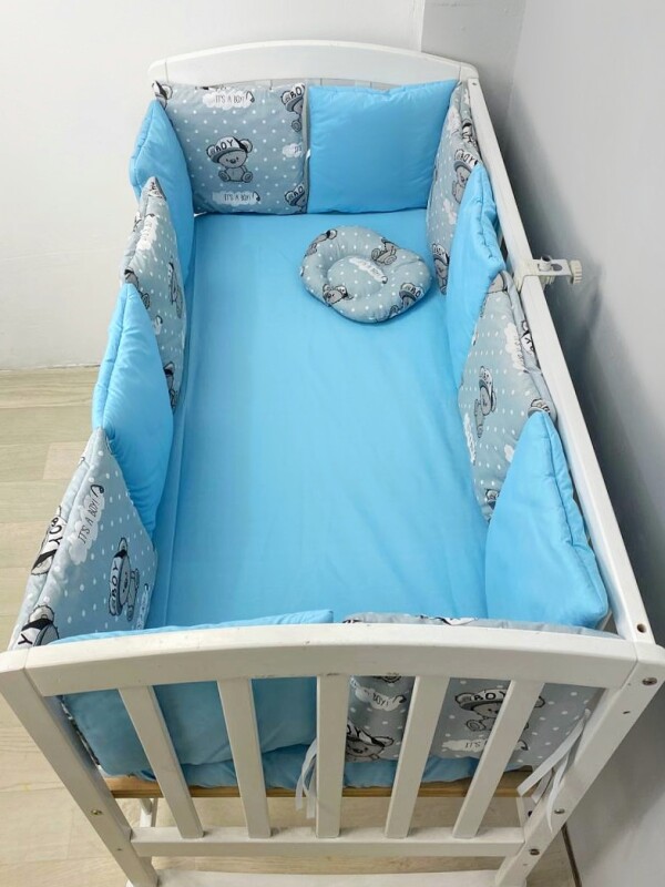 Захист у ліжечко - плоскі подушки на 4 боки + простирадло та подушка, Блакитно- сірий з ведмедиками