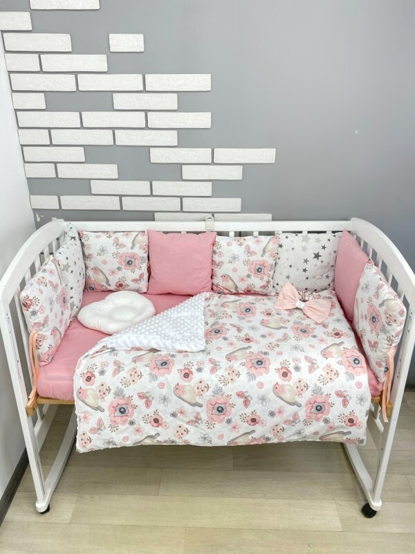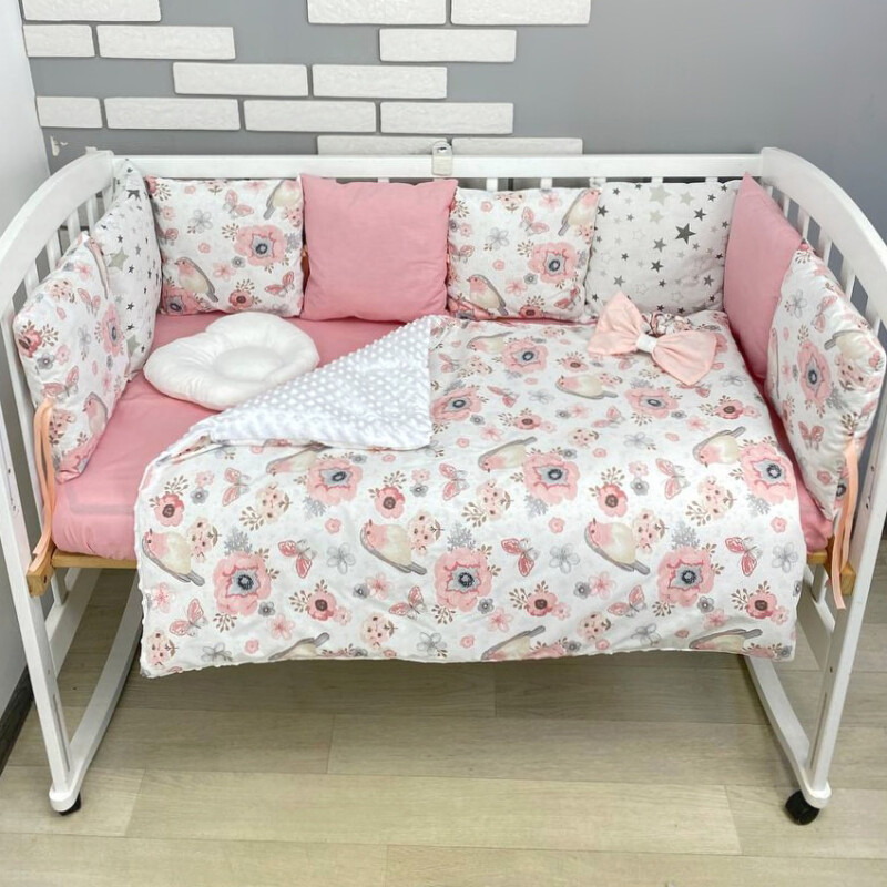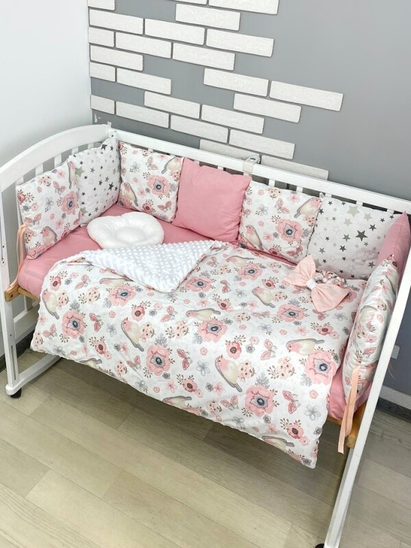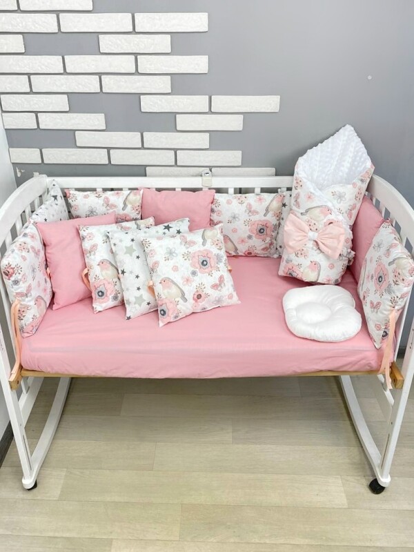 Комплект постільної билизни, в дитяче ліжечко. Рожево- пудровий з пташками та квіточками
