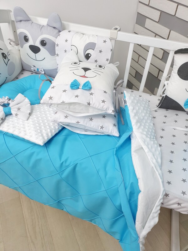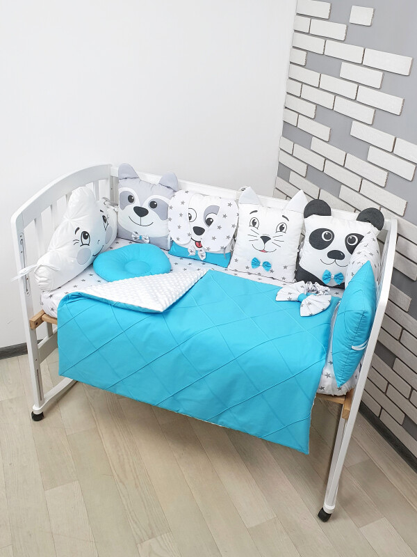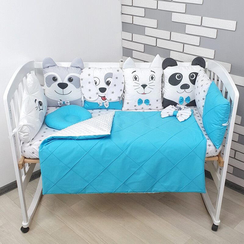 Характерною особливістю цього комплекту є присутність м'якої хмаринки з мордочкою або 2 подушок, які створюють затишну та безпечну атмосферу для вашого дитинства. Приємне доповнення - підковдра з плюшевим покриттям та біла бавовняна ковдра із силіконовим утеплювачем розміром 100*80 см, які гарантують тепло та комфорт.