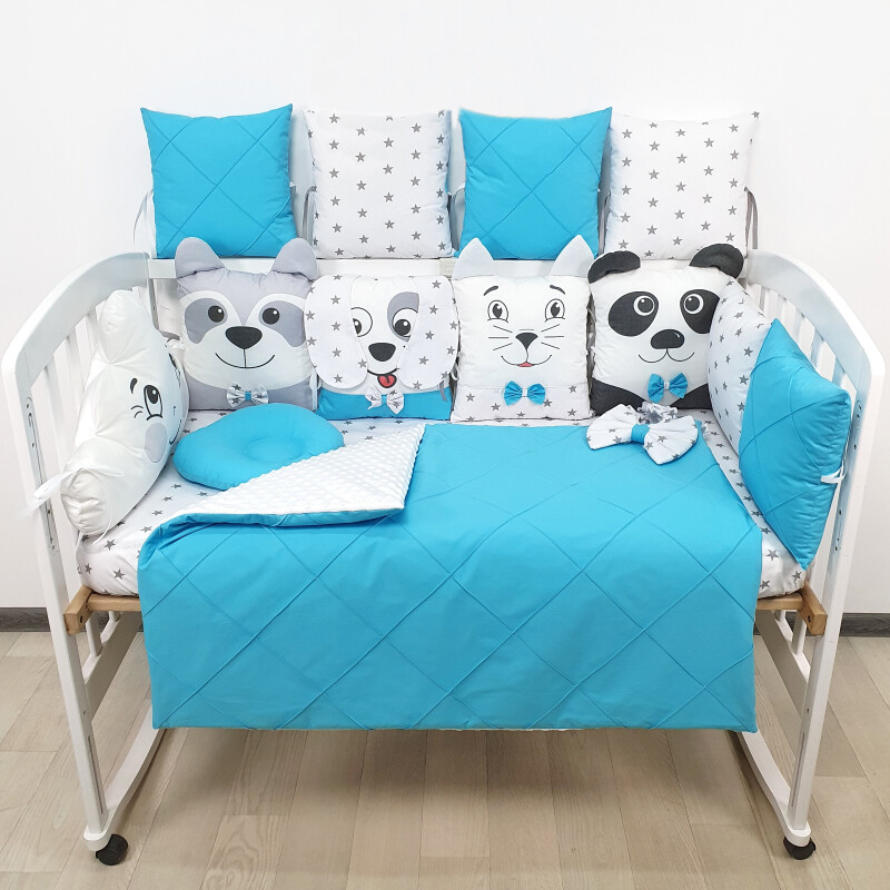 Комплект постільної білизни, в дитяче ліжечко. Яскраво-блакитні іграшки з хмаринкою