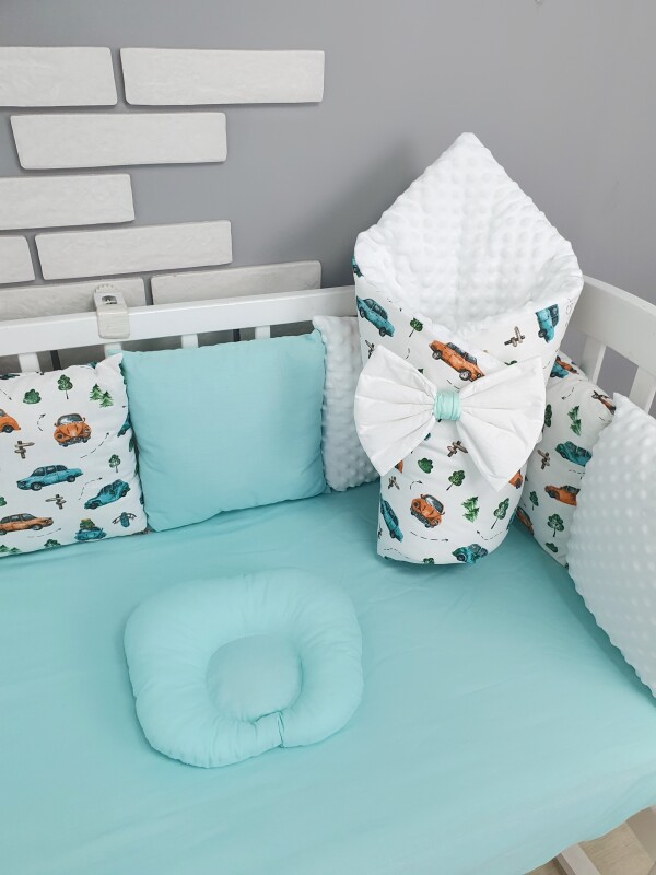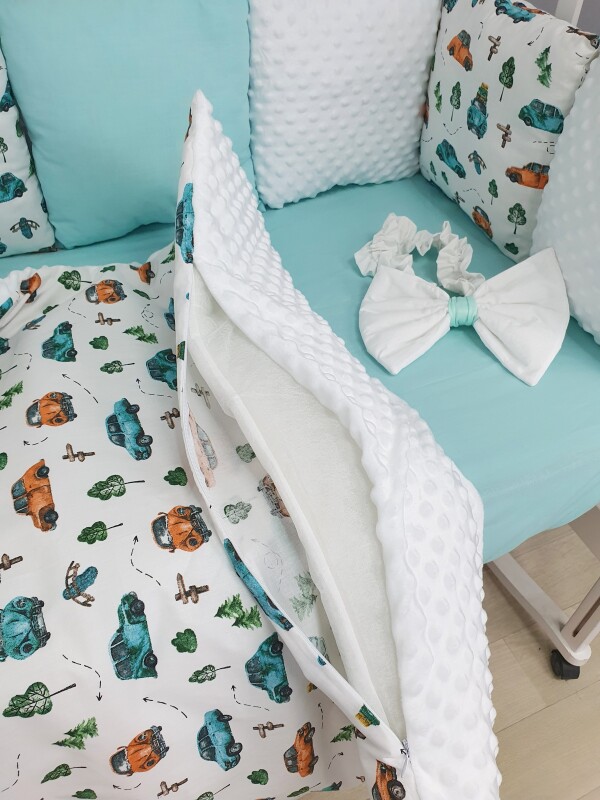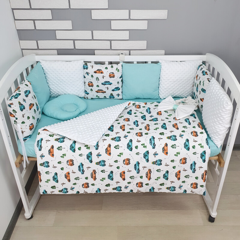 Комплект постільної білизни, в дитяче ліжечко. Бірюзові машинки