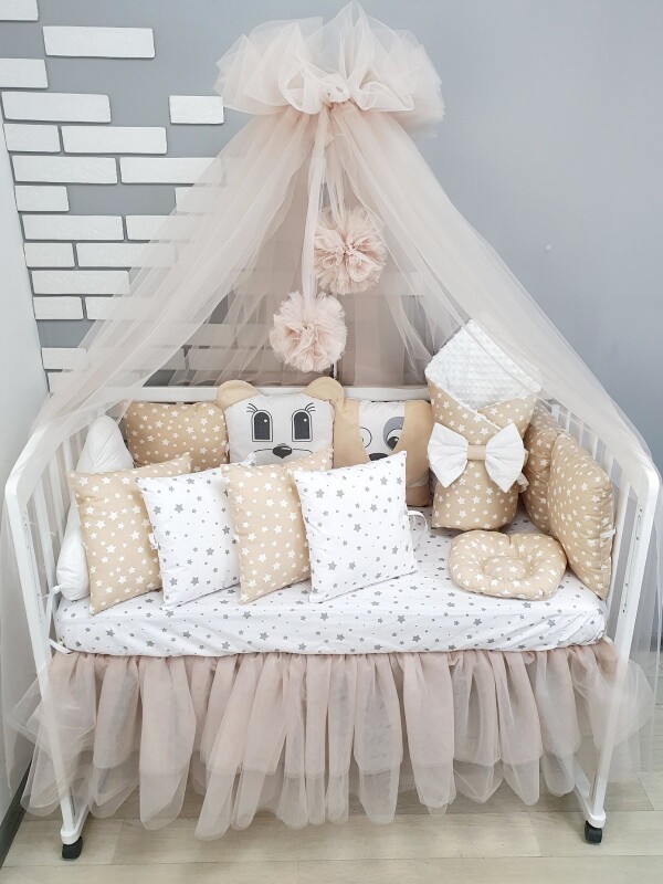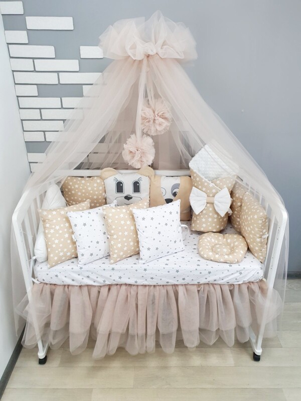Juno, интернет-магазин детских товаров\\Комплект постільної білизни, в дитяче ліжечко. Бежевий в зірочку, з подушками