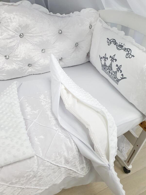 Комплект Білий бархат із каретною стяжкою зі стразами та коронами принт