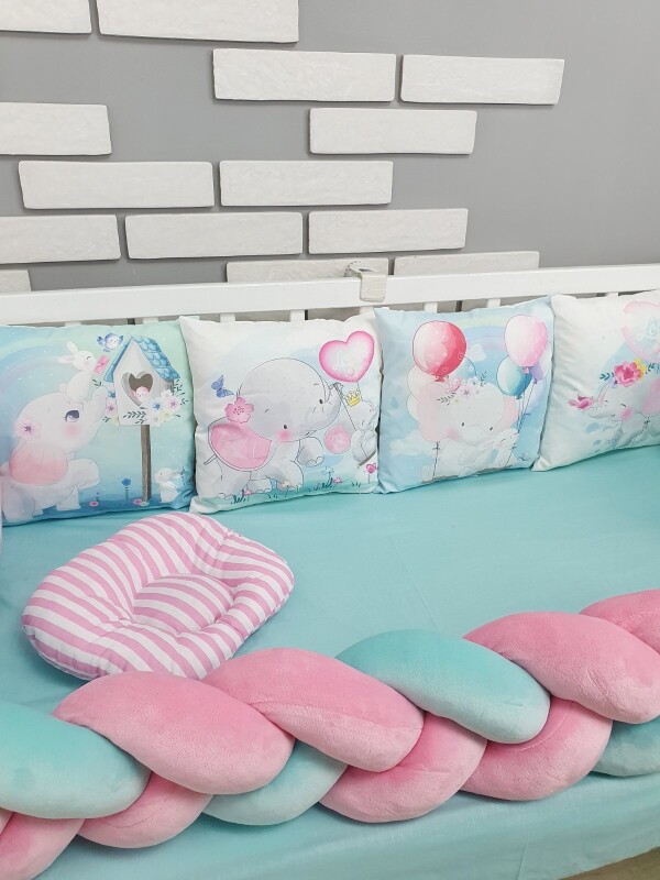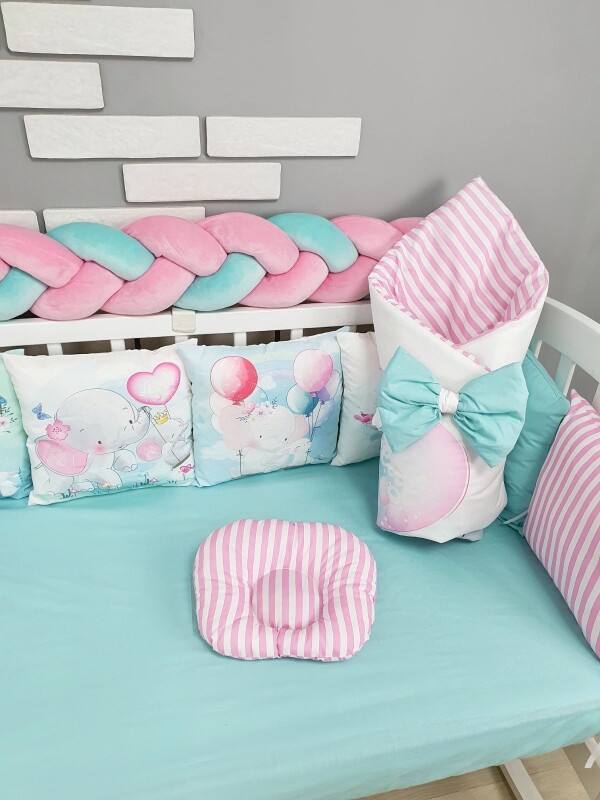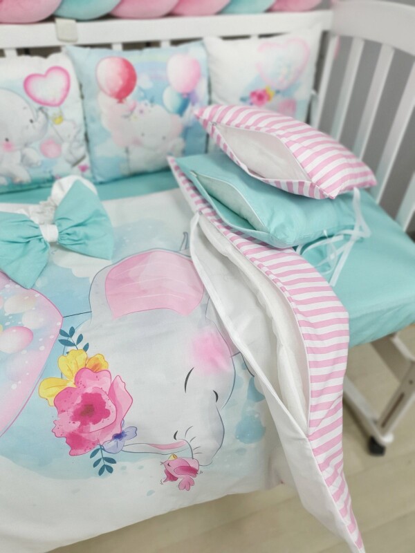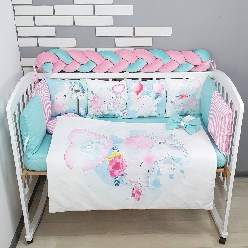 Комплекти постільної білизни, в дитяче ліжечко. Слоники м'ятно-рожеві