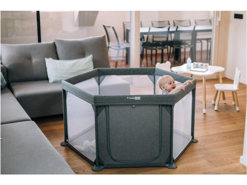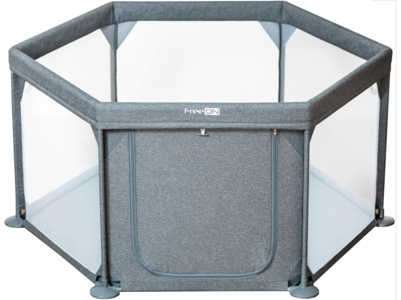 Шестикутний манеж з меланжевого текстилю дає дитині достатньо простору для руху та ігор. Ручки забезпечують додаткову підтримку дитини під час вставання та сидіння. Отвір із застібкою-блискавкою призначений для самостійної гри дитини та дозволяє дитині входити та виходити з манежу.