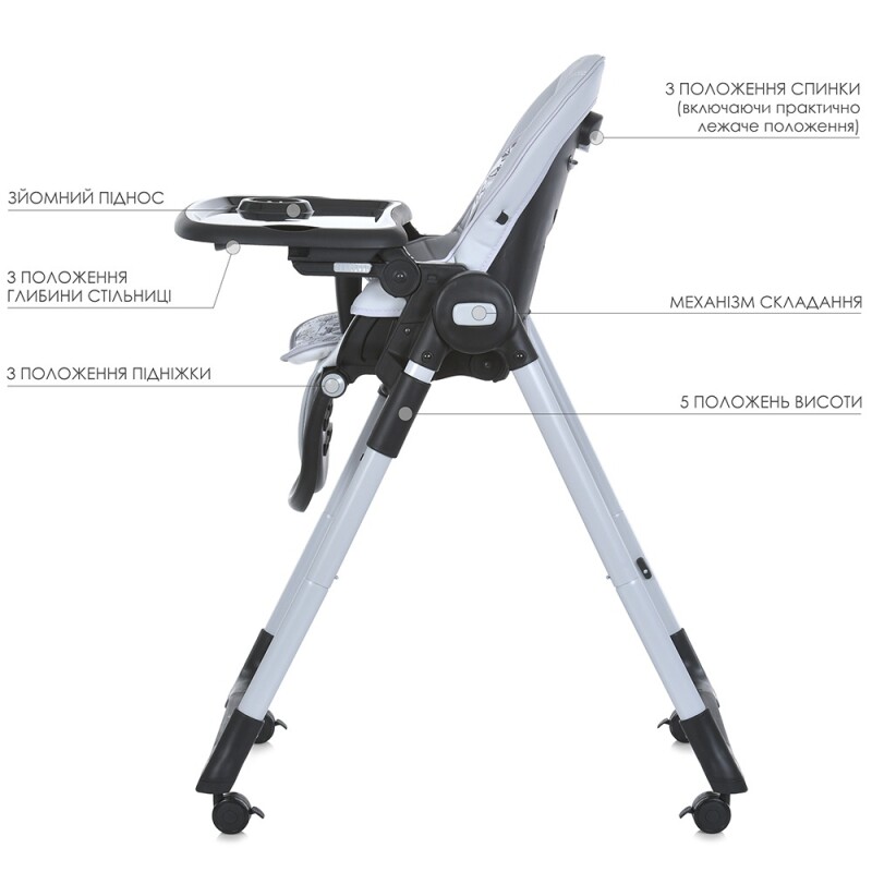 Стілець можна використовувати в 5-ти положеннях по висоті. Спинка сидіння регулюється по куту нахилу в 3-х положеннях для комфортного відпочинку дитини. Вкладка на сидіння виготовлена з екошкіри для зручності миття. Завдяки коліщаткам зі стопорами на всіх ніжках, стілець можна переміщати не піднімаючи його.
