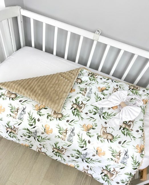 В комплект входить: ковдра з плюшем зі з'ємним утеплювачем (силікон 200 в чохлі) та бантик на резинці.