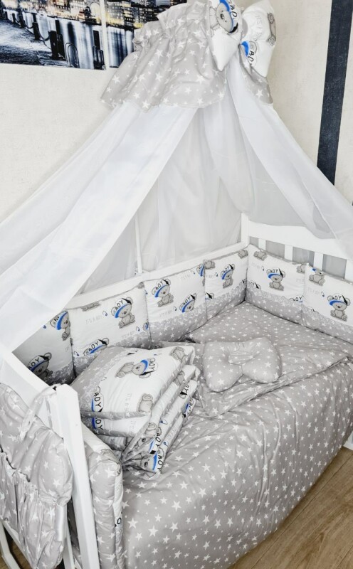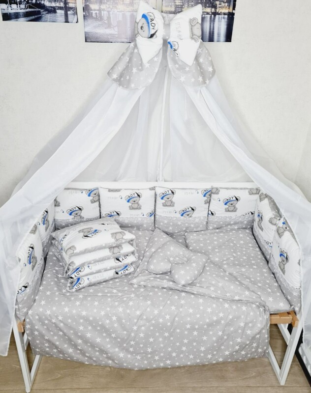 Опис: 1. Підковдра: 90х110 см 2. Наволочка: 40х60 см 3. простирадло на гумці 60х120 4. захист ( складається з 12 подушечок, комбіновані) 5. ковдра 90х110 см 6. подушка 40х60 см 7. кишеня для пляшечок 8. балдахін 9. Ортопедична подушка
